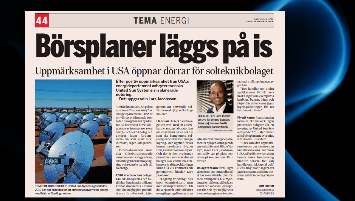 Dagens Industri (Sweden’s leading business magazine) reports about why USS’ IPO plans are on hold due to the large attention in the US. Following positive attention from the US Department of Energy, Swedish United Sun Systems puts its planned stock exchange listing on hold, states CEO Lars Jacobsson.