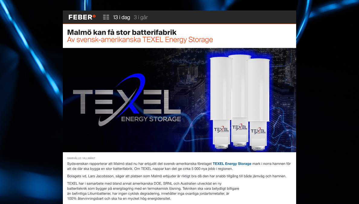 Sydsvenskan reports that the city of Malmö has now offered the Swedish-American company TEXEL Energy Storage land in the northern harbor for them to build a large battery factory there. If TEXEL proceeds, it could create about 5,000 new jobs in the region.
