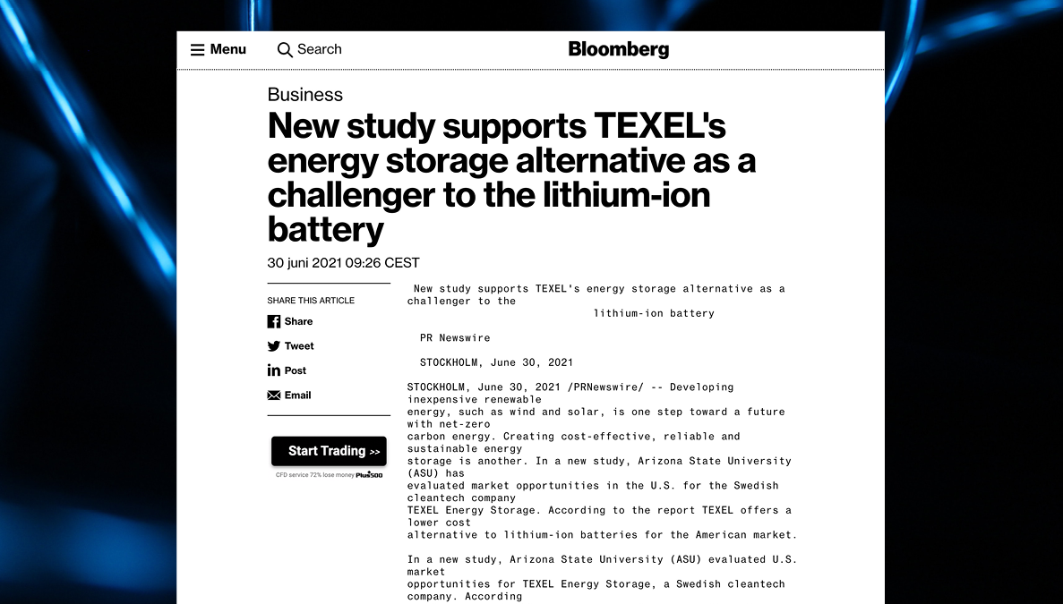“The ASU study shows that TEXEL has a great opportunity in the American market and that we have the right focus in targeting the California market. It also shows that our technology is a hugely competitive alternative to existing energy storage technologies, such as lithium-ion batteries. An economically viable and circular energy storage technology is needed to be able to create