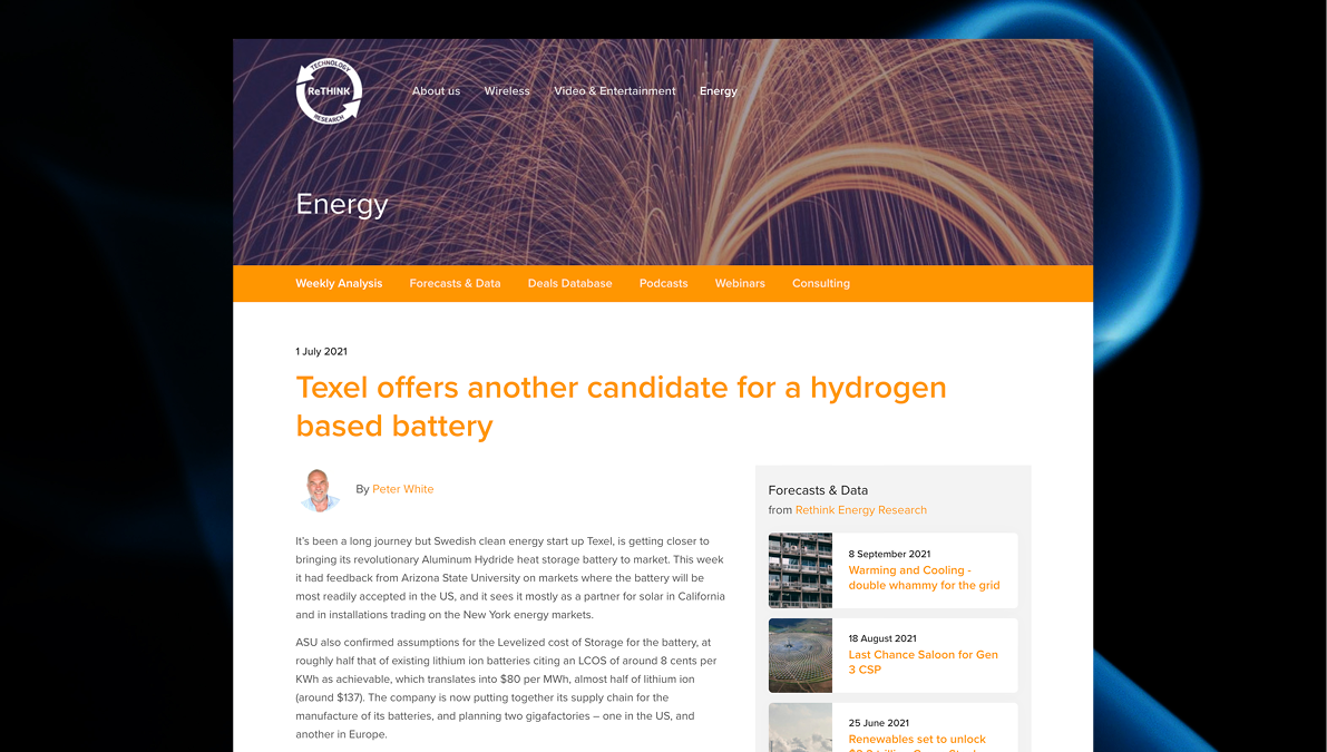 It’s been a long journey but Swedish clean energy start up Texel, is getting closer to bringing its revolutionary Aluminum Hydride heat storage battery to market. This week it had feedback from Arizona State University on markets where the battery will be most readily accepted in the US, and it sees it mostly as a partner for solar in California and in installations trading on the New York energy markets.